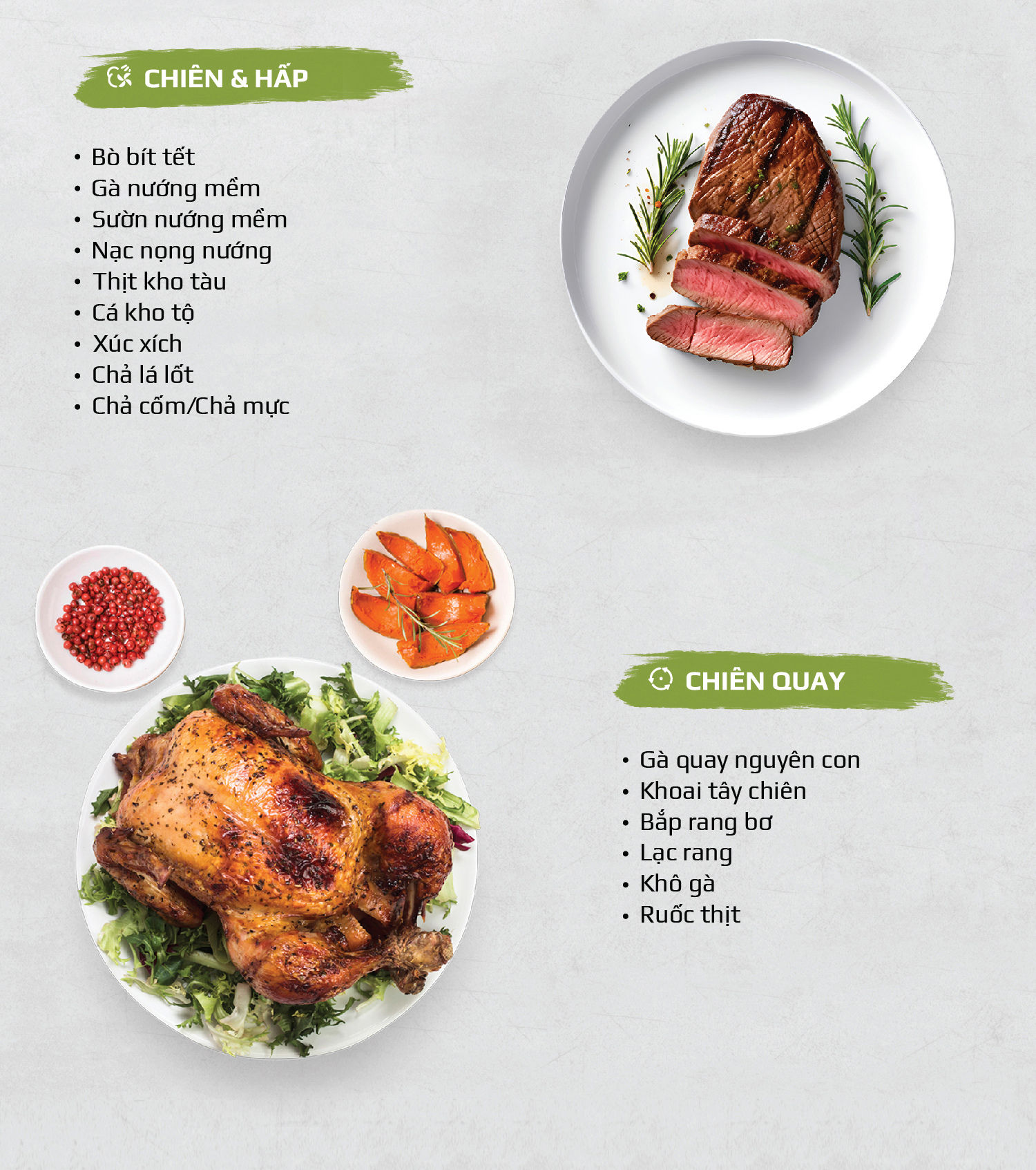 • Sử dụng nồi chiên hơi nước giúp bạn chế biến đa dạng món ngon, nấu những bữa ăn dinh dưỡng, lành mạnh, ít dầu mỡ, tiết kiệm thời gian tối đa.