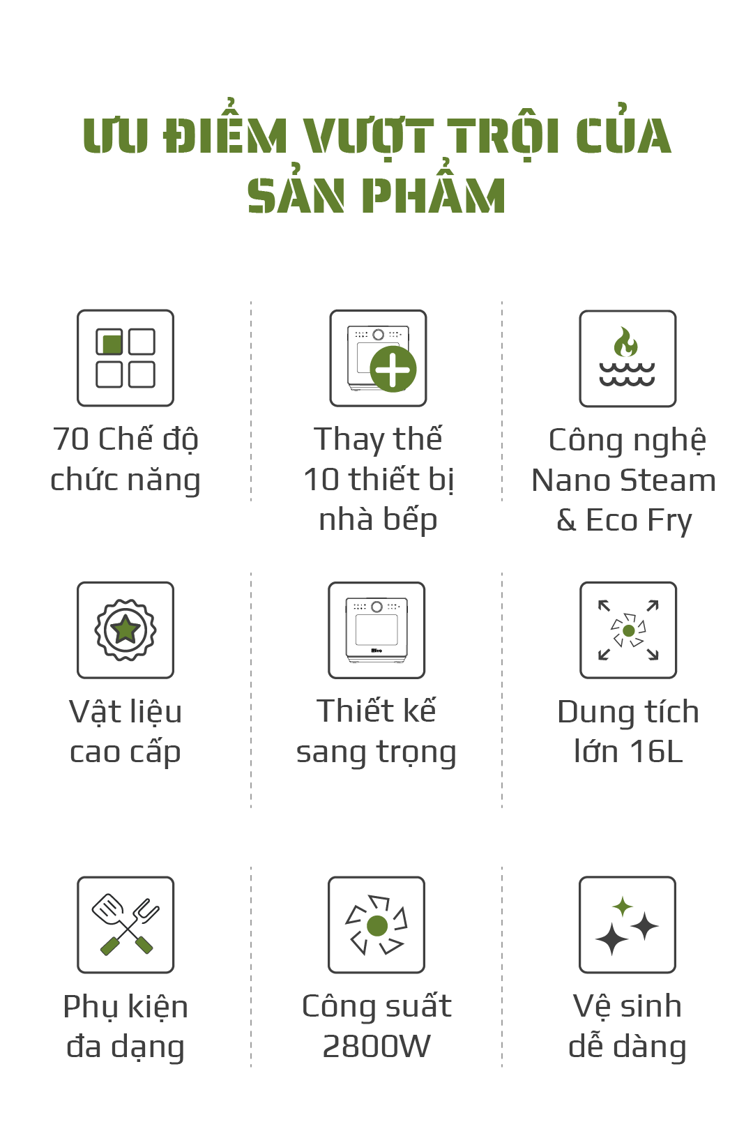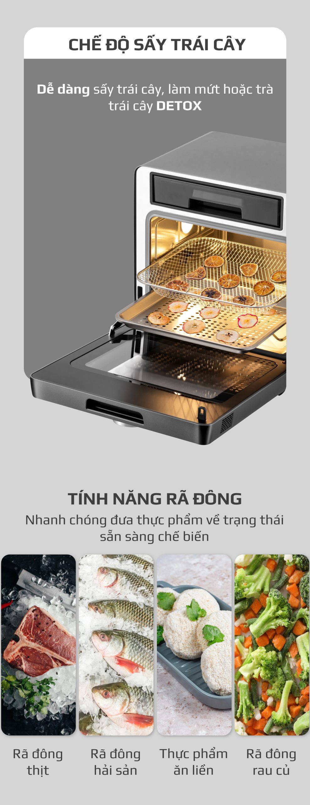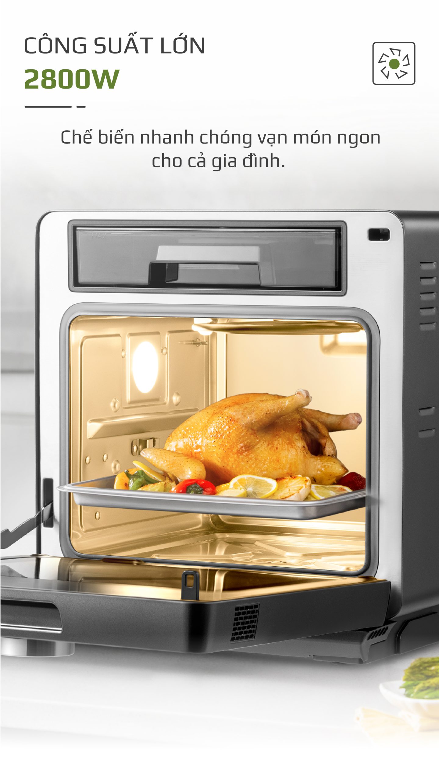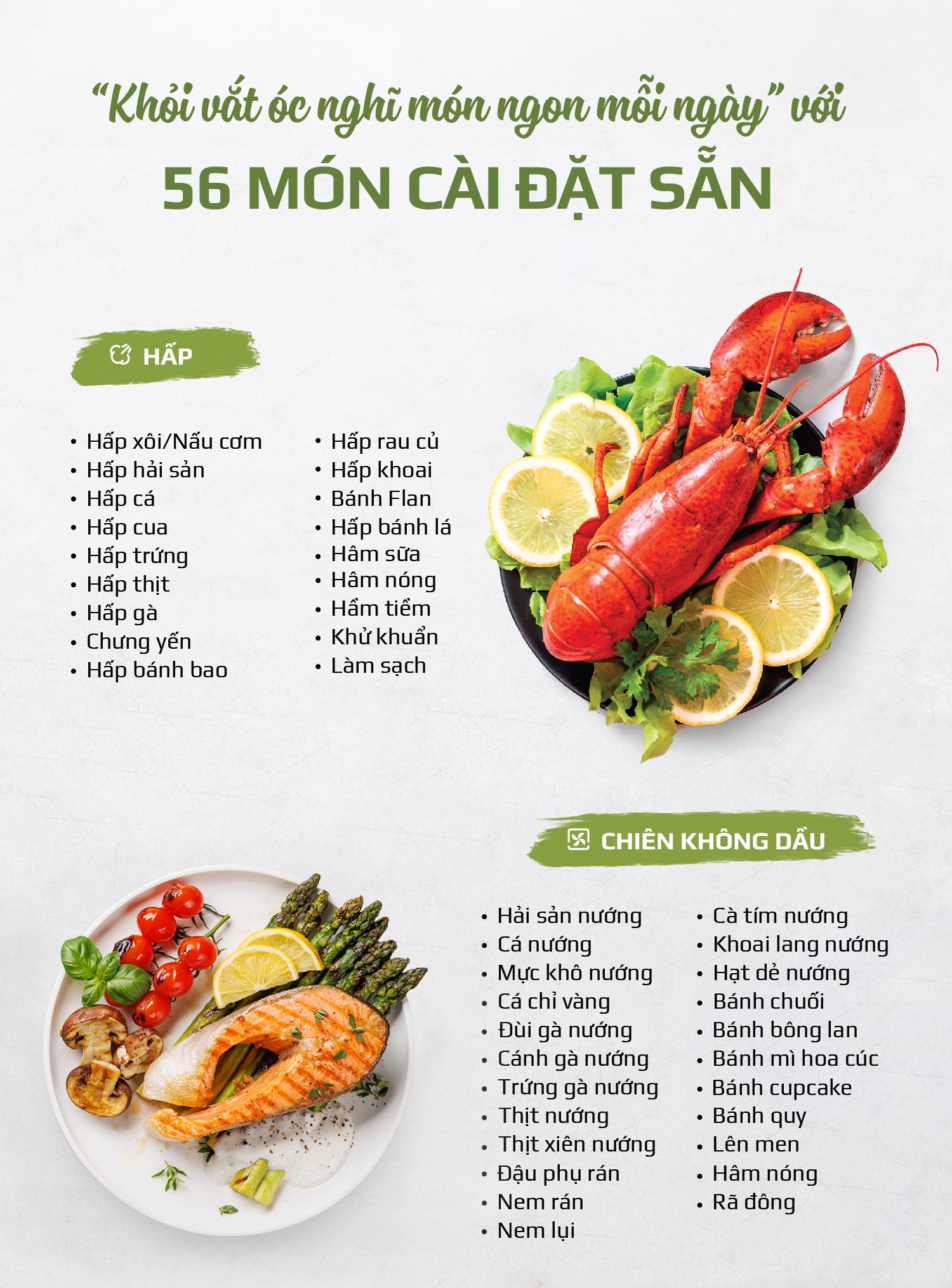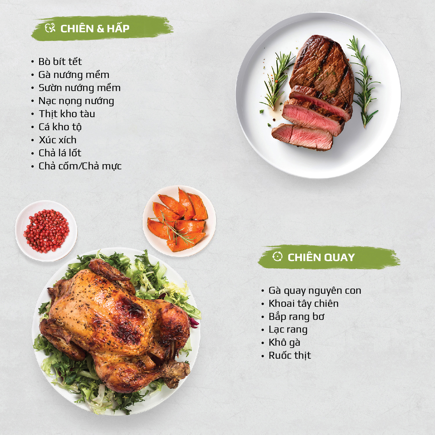 • Chiên không dầu chiên đồ ăn vàng giòn mà không cần dùng đến dầu mỡ, giảm đến 95% lượng dầu mỡ dư thừa trong bữa ăn hàng ngày. Trong khi đó, hấp đồ ăn bằng hơi nước siêu nhiệt giúp giảm thời gian hấp, đồng thời bảo toàn tối đa dinh dưỡng có trong thực phẩm.