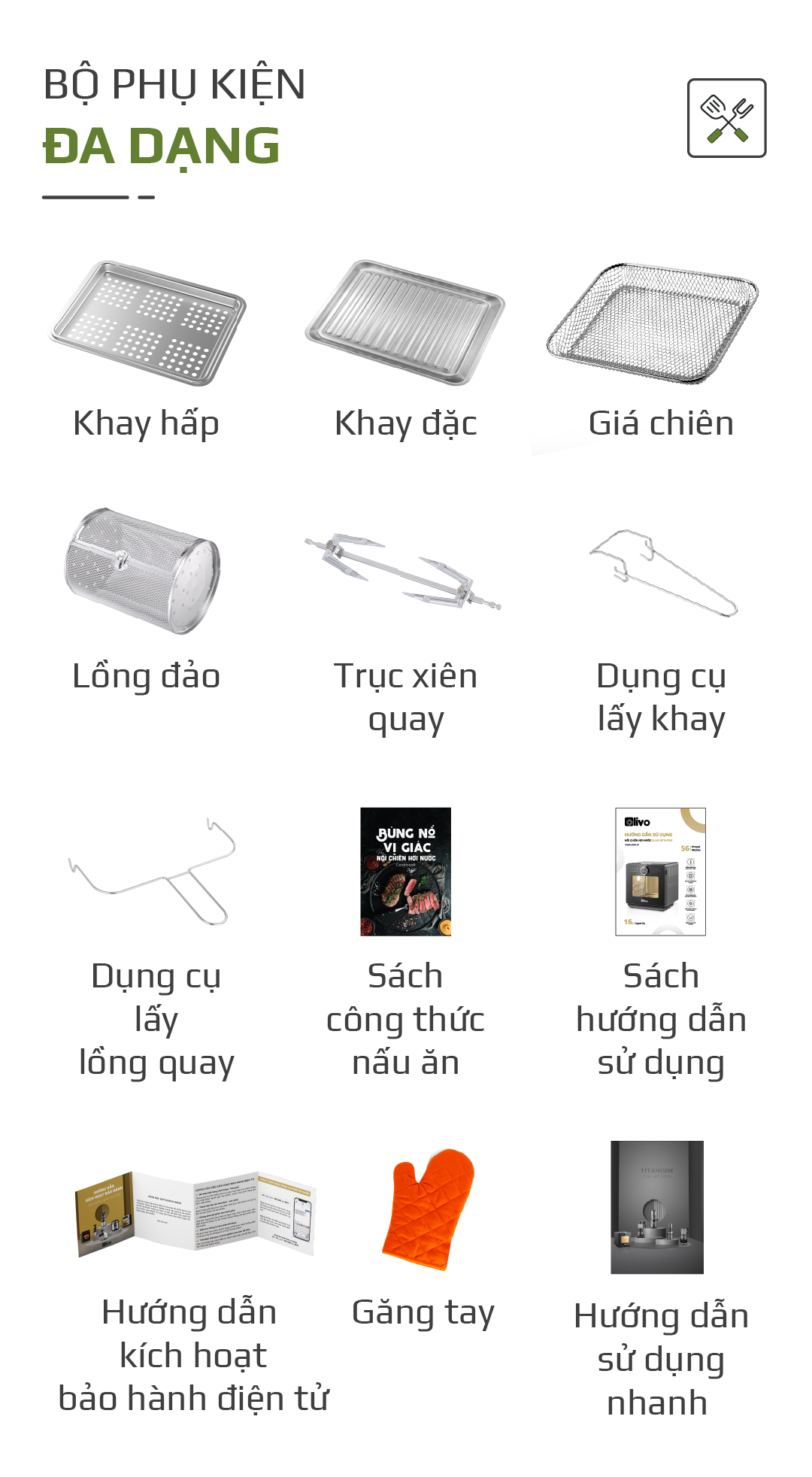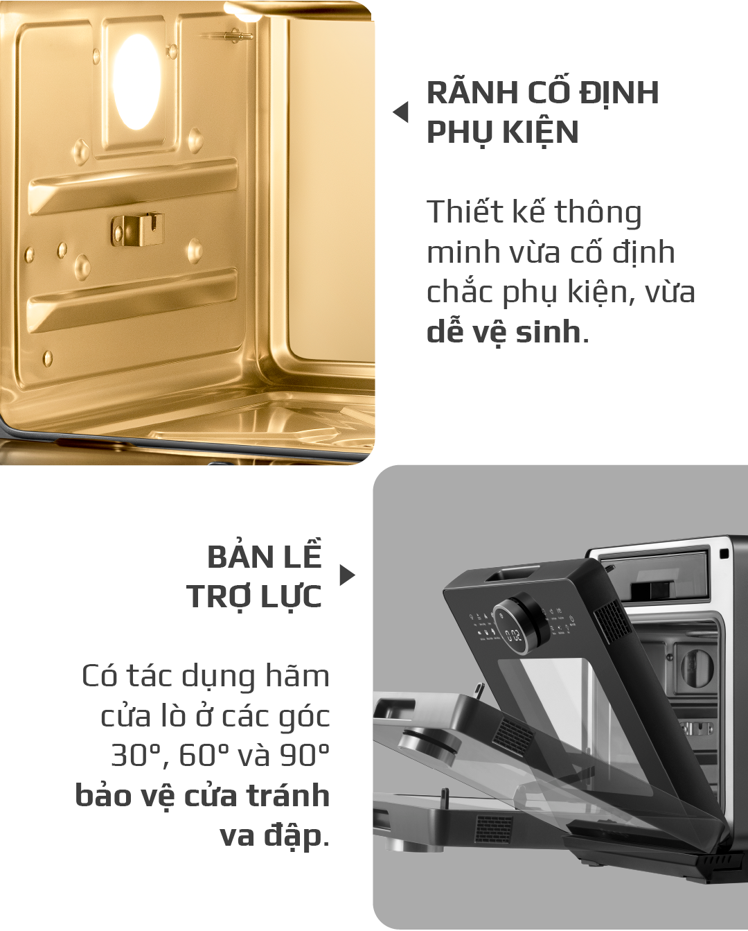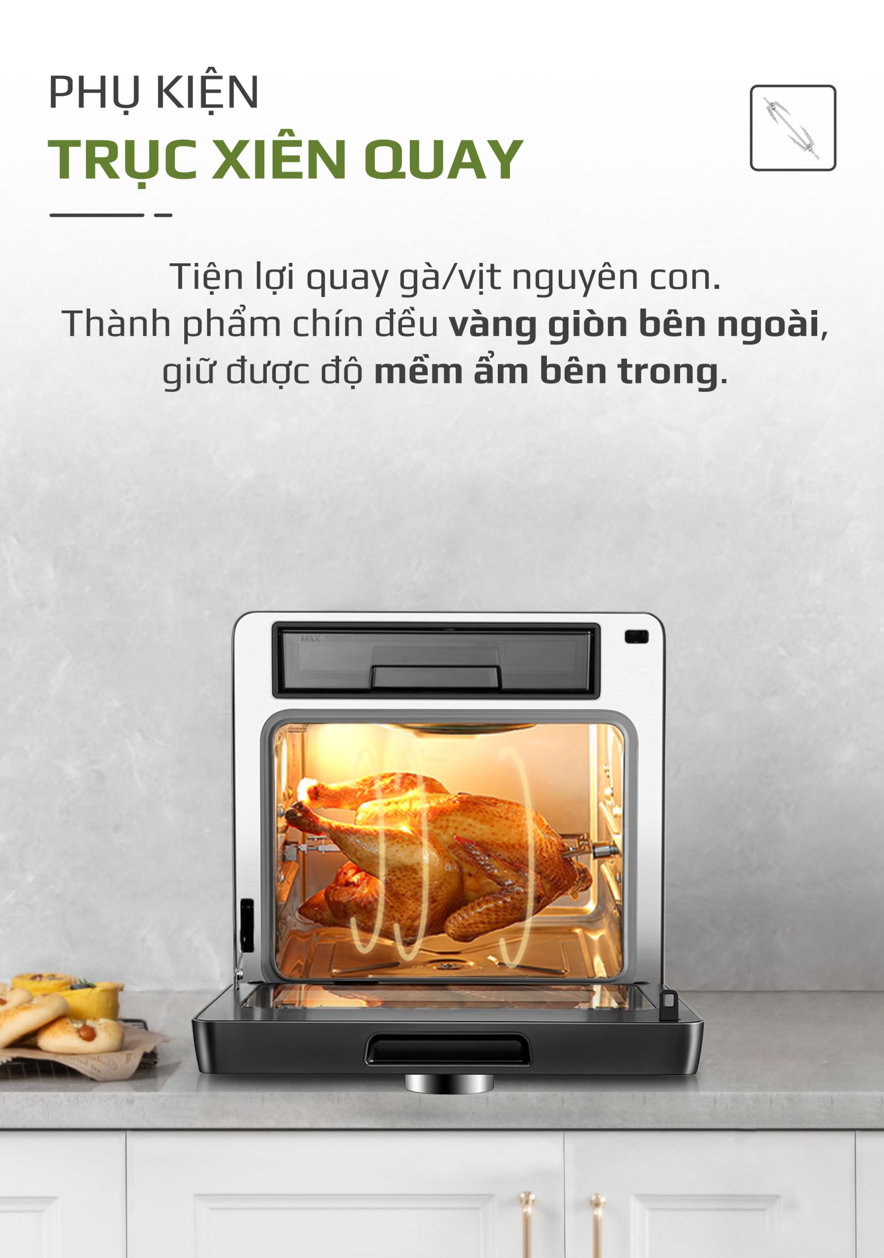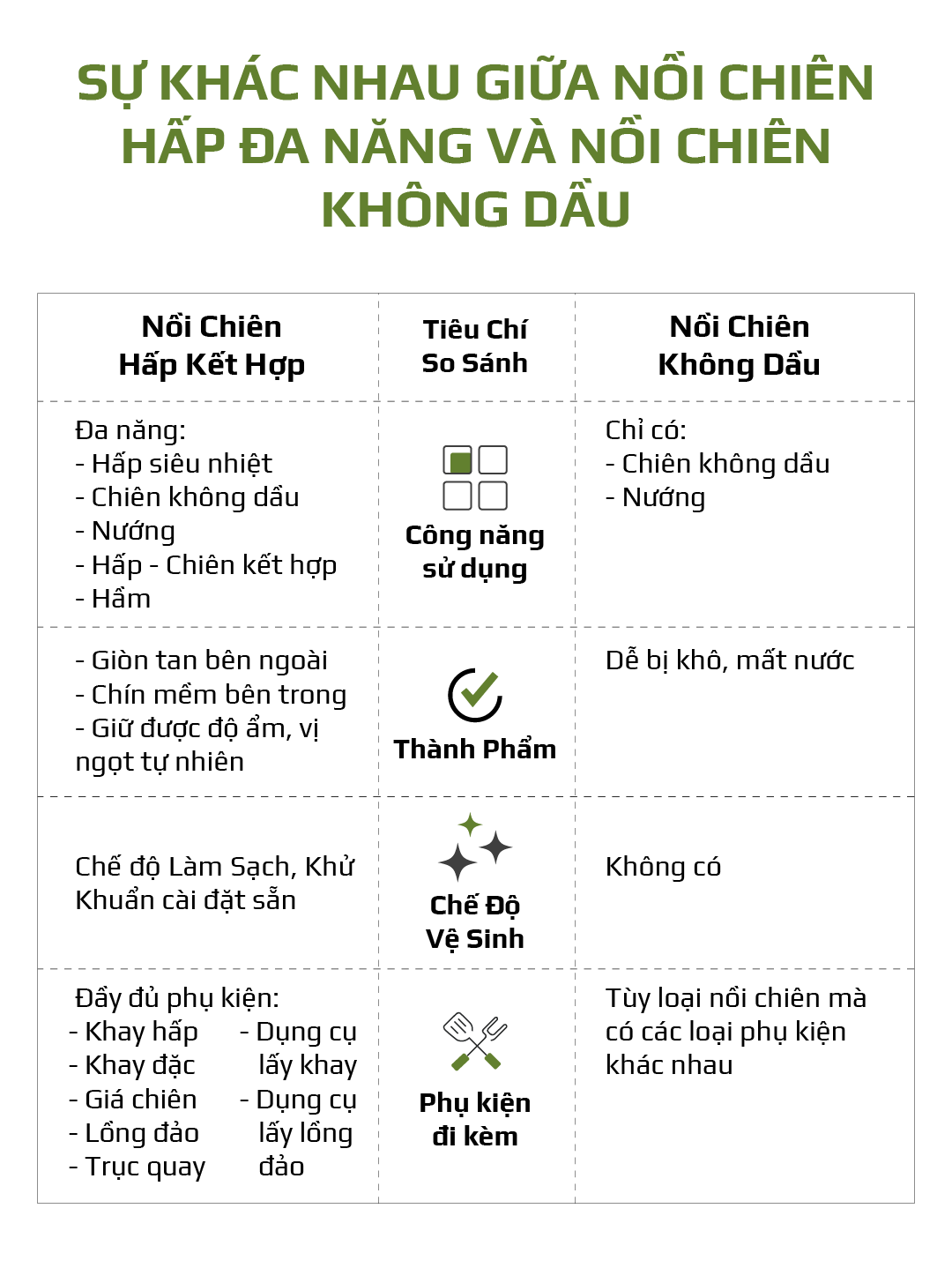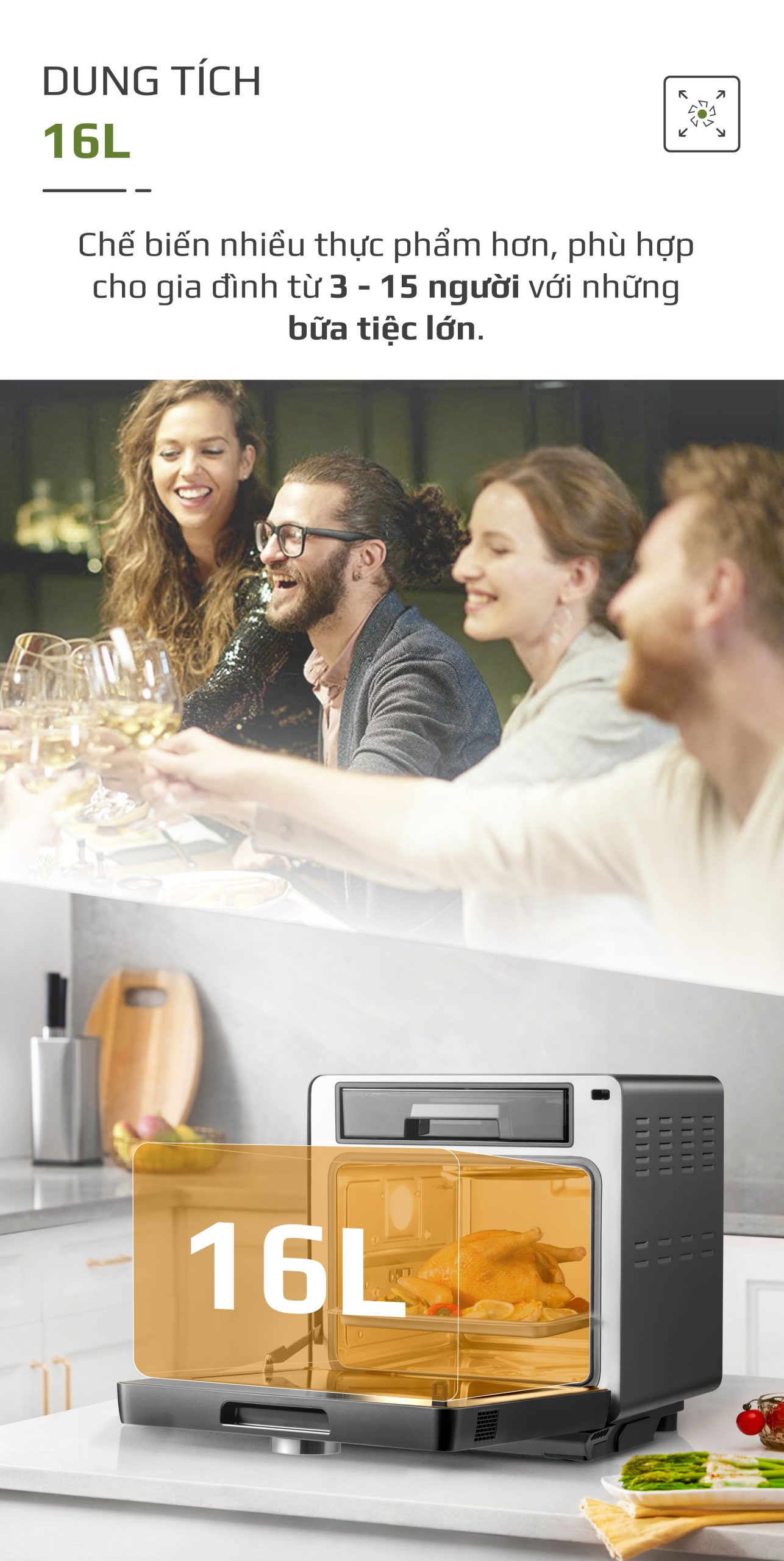 • Chiên không dầu chiên đồ ăn vàng giòn mà không cần dùng đến dầu mỡ, giảm đến 95% lượng dầu mỡ dư thừa trong bữa ăn hàng ngày. Trong khi đó, hấp đồ ăn bằng hơi nước siêu nhiệt giúp giảm thời gian hấp, đồng thời bảo toàn tối đa dinh dưỡng có trong thực phẩm.