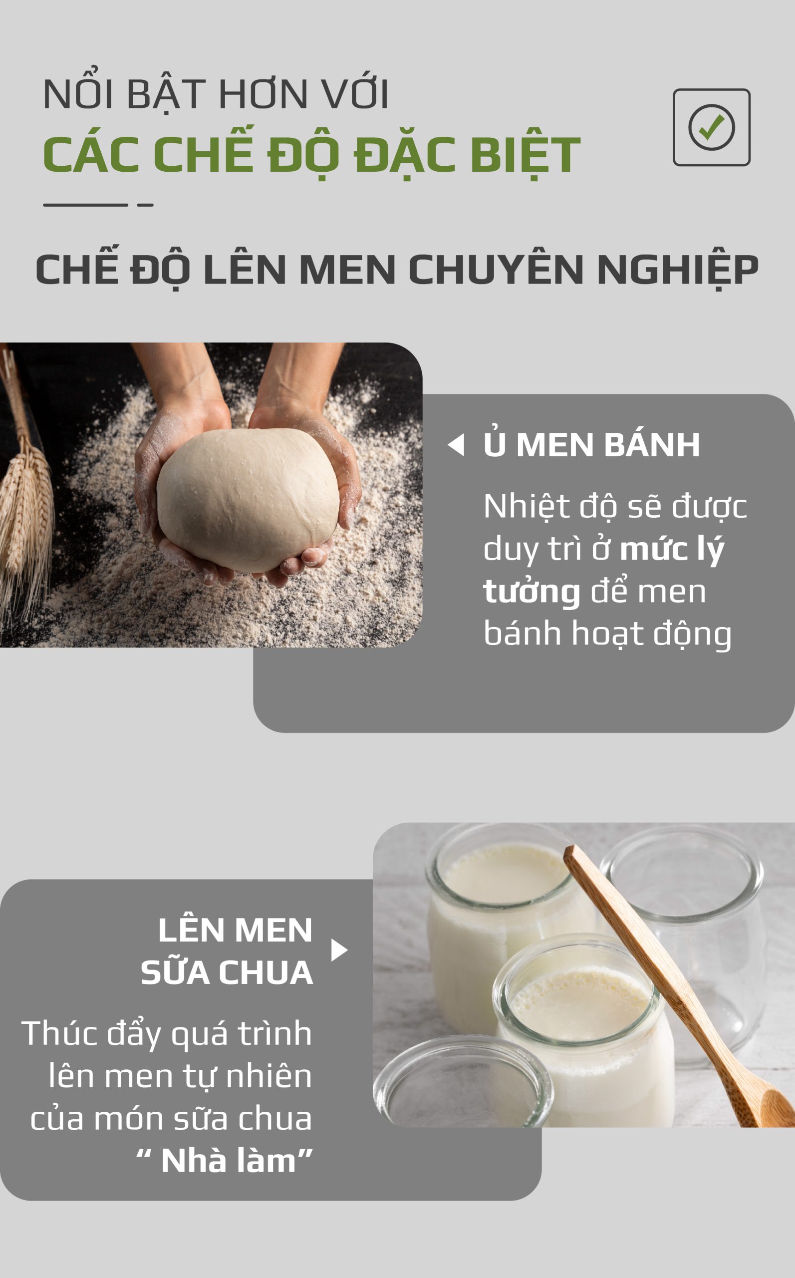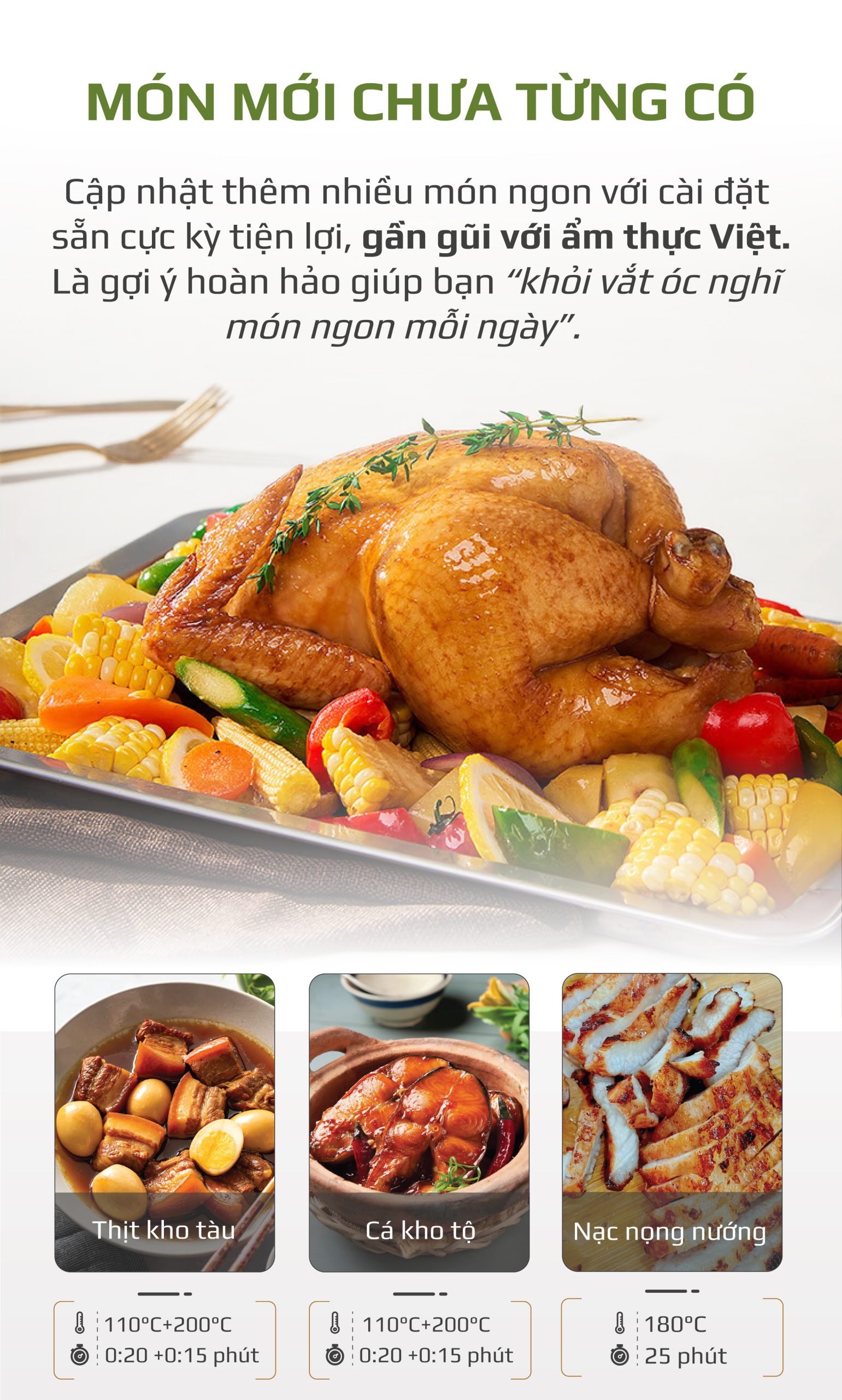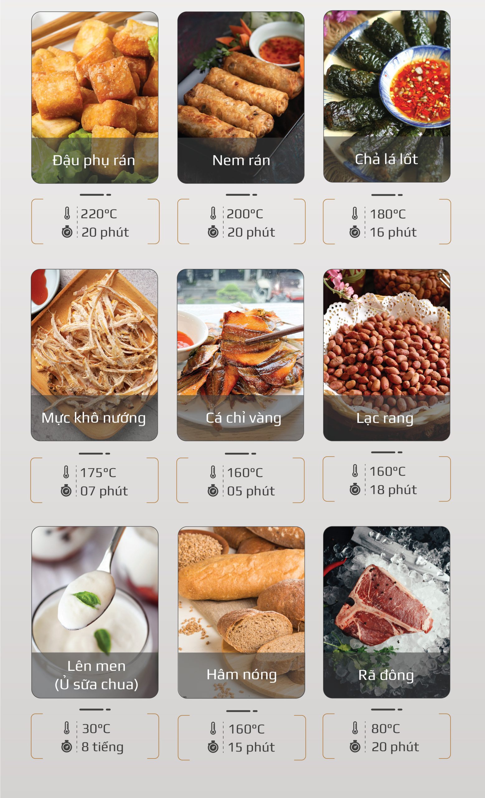 • Ngoài 13 chương trình setup trên bảng điều khiển bên ngoài, còn có menu 56 món cài đặt sẵn phù hợp với ẩm thực và phong tục chế biến món ăn của người Việt.