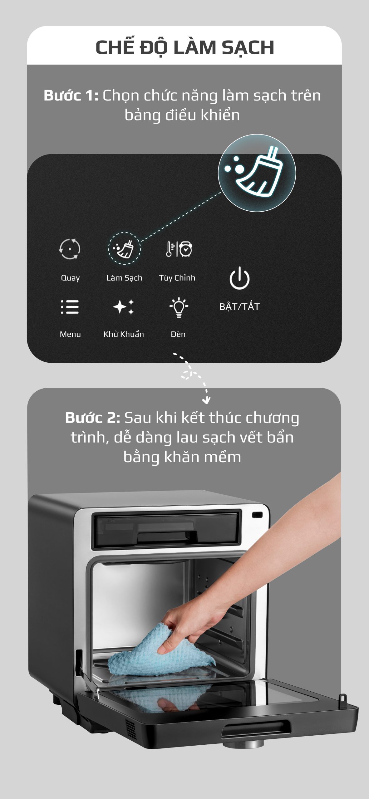 • Ngoài ra, sau khi chọn chức năng Làm Sạch có thể chọn thêm chức năng Khử Khuẩn để làm sạch sâu, loại bỏ vi khuẩn đảm bảo khoang nồi luôn sạch bong, sáng bóng.