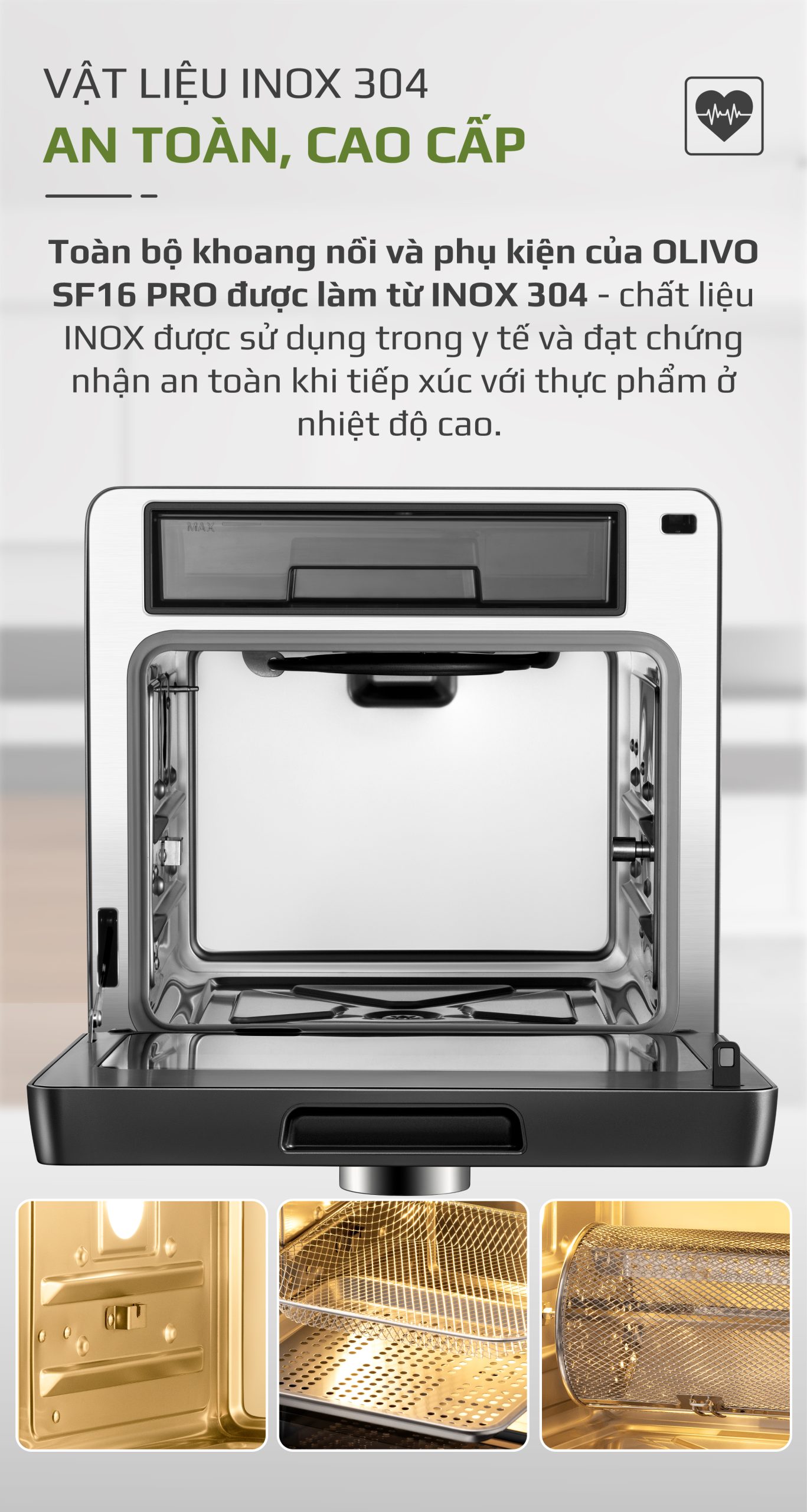 • Đặt sức khoẻ của khách hàng làm tiêu chí hàng đầu, khoang nồi của Nồi chiên hấp OLIVO SF16 PRO được làm từ INOX 304 cao cấp, an toàn với sức khỏe người dùng. Chất liệu INOX cũng cho nồi khả năng dẫn nhiệt và giữ nhiệt tốt vượt trội.