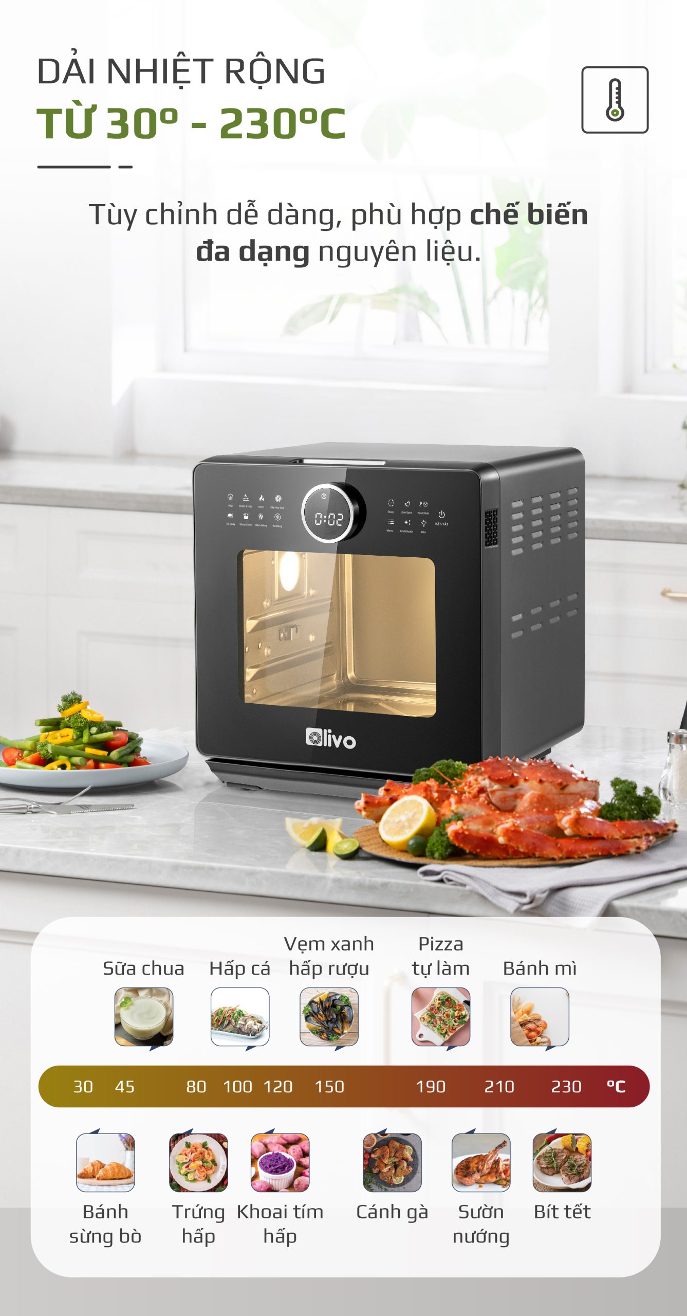 • Nồi chiên hơi nước OLIVO SF16 PRO có dải nhiệt từ 30-230 độ C, đây được coi là dải nhiệt rộng ấn tượng ở một chiếc nồi chiên. Với dải nhiệt rộng vượt trội, bạn có thể dùng nồi để chế biến nhiều món hơn như ủ sữa chua, sấy hoa quả đến quay gà, tôm, cá…