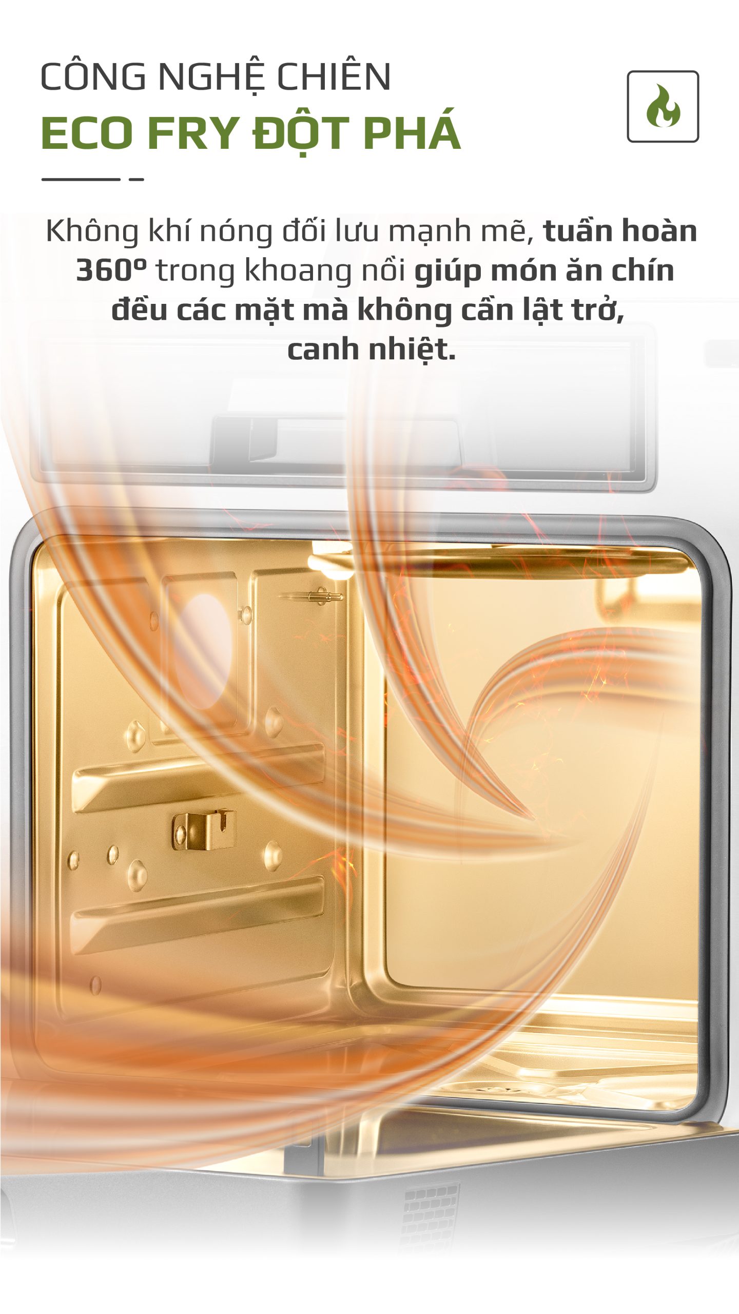• Công nghệ Eco Fry sẽ đối lưu luồng không khí nóng mạnh mẽ, tuần hoàn 360 độ trong khoang nồi kết hợp phụ kiện trục quay, xiên quay, lồng đảo giúp món ăn đảm bảo chín đều vàng giòn các mặt mà không cần lật trở, canh nhiệt.