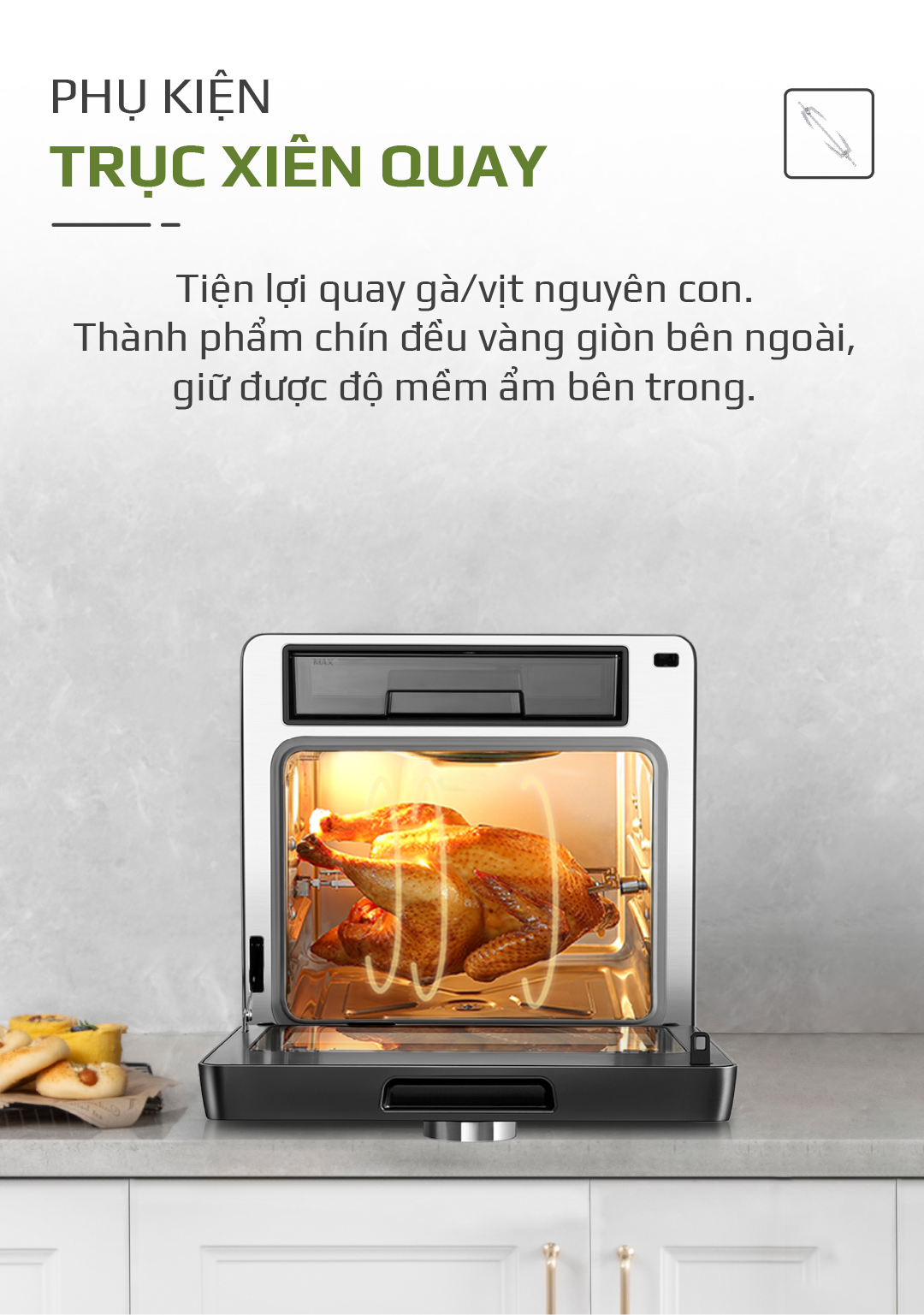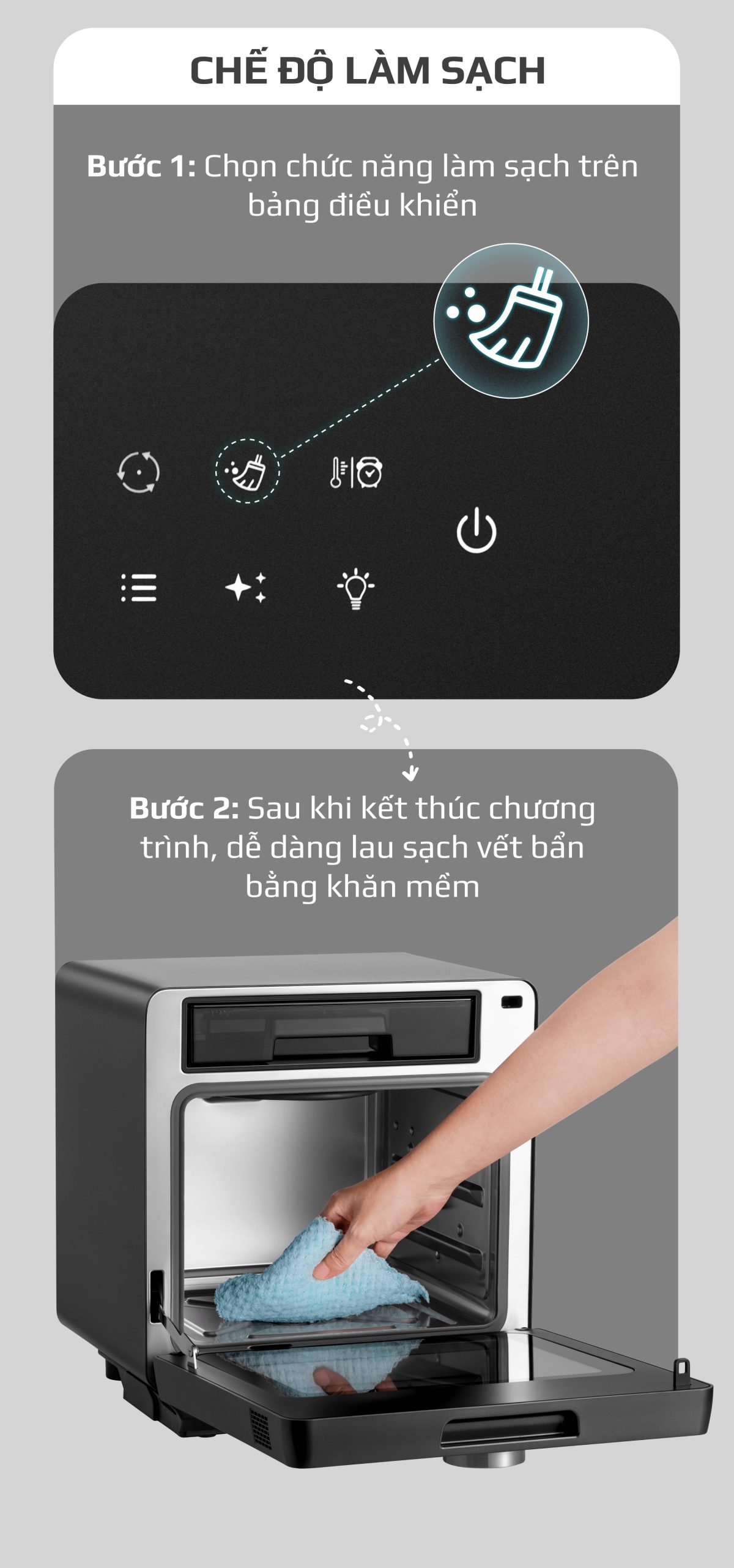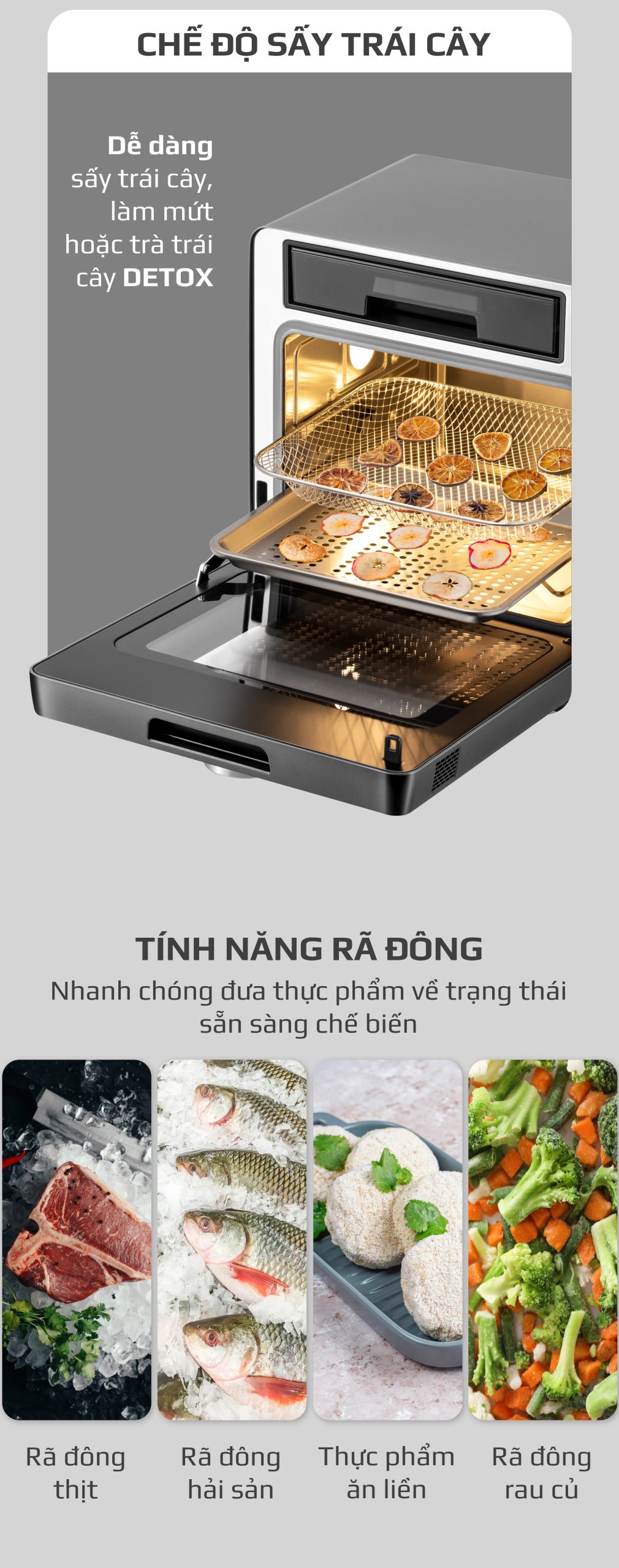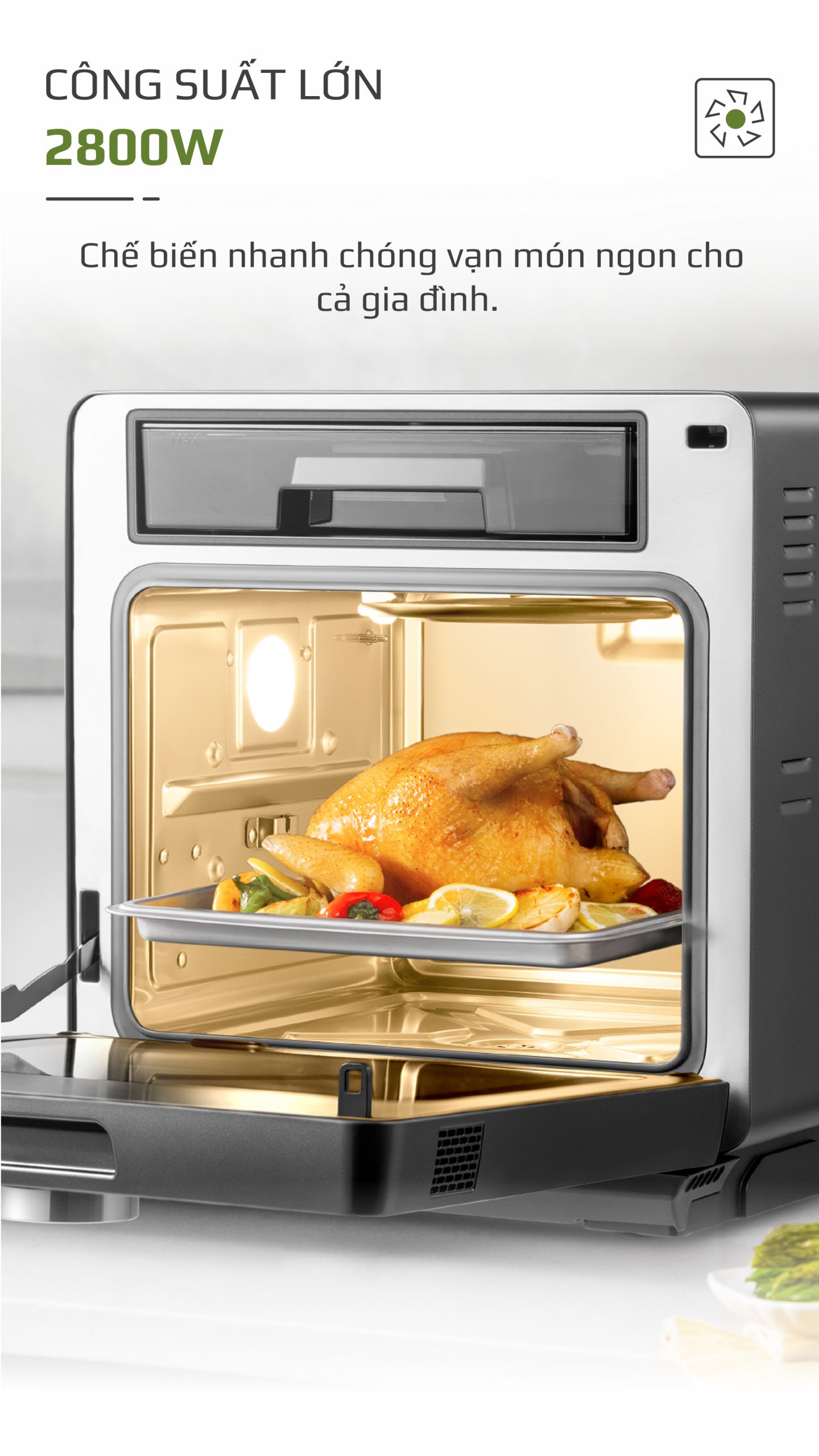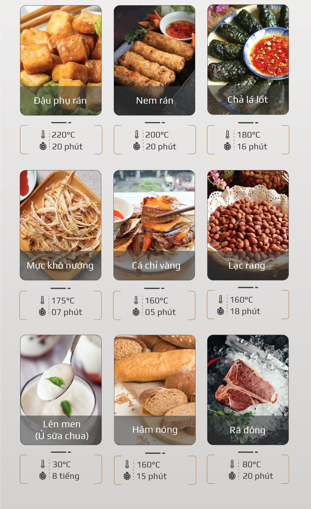 Chiên không dầu chiên đồ ăn vàng giòn mà không cần dùng đến dầu mỡ, giảm đến 95% lượng dầu mỡ dư thừa trong bữa ăn hàng ngày. Trong khi đó, hấp đồ ăn bằng hơi nước siêu nhiệt giúp giảm thời gian hấp, đồng thời bảo toàn tối đa dinh dưỡng có trong thực phẩm.
