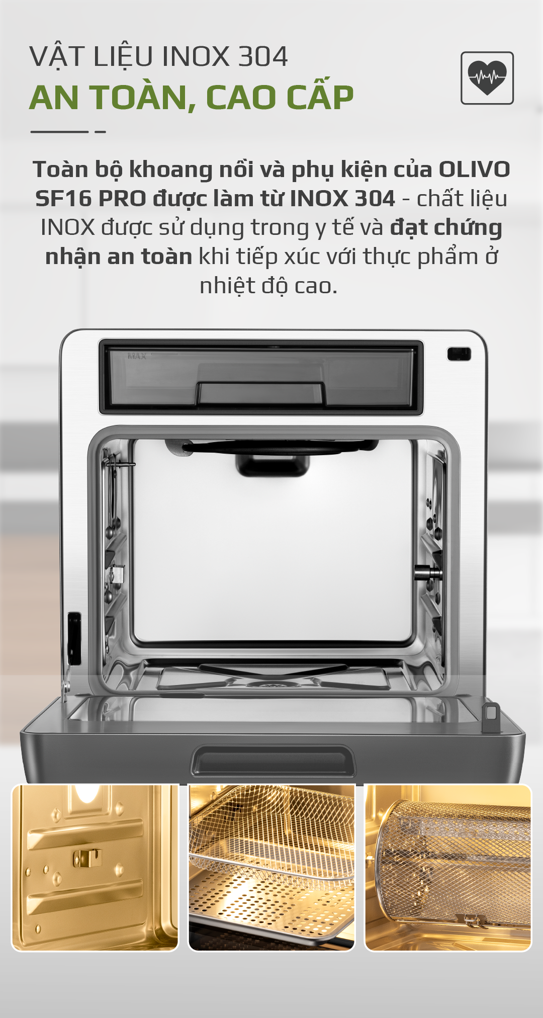 Đặt sức khoẻ của khách hàng làm tiêu chí hàng đầu, khoang nồi của Nồi chiên hấp OLIVO SF16 PRO được làm từ INOX 304 cao cấp, an toàn với sức khỏe người dùng. Chất liệu INOX cũng cho nồi khả năng dẫn nhiệt và giữ nhiệt tốt vượt trội.