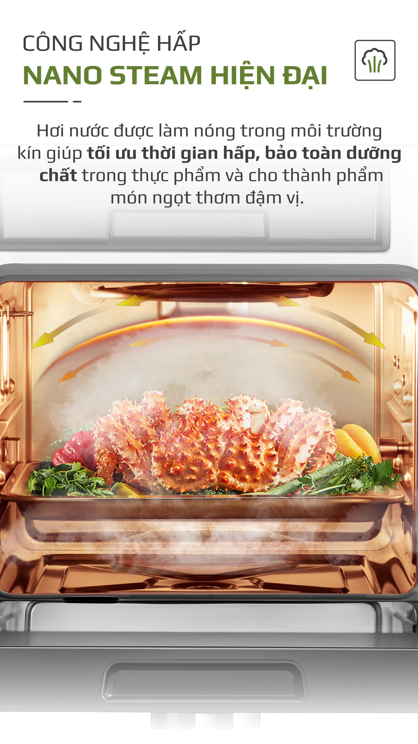 Sản phẩm ứng dụng công nghệ Nano Steam làm nóng hơi nước trong môi trường kín kết hợp hệ thống phun hơi nước siêu nhiệt giúp bảo toàn dưỡng chất trong thực phẩm, tối ưu thời gian nấu. Cho thành phẩm món hấp ngọt thơm, đậm vị.